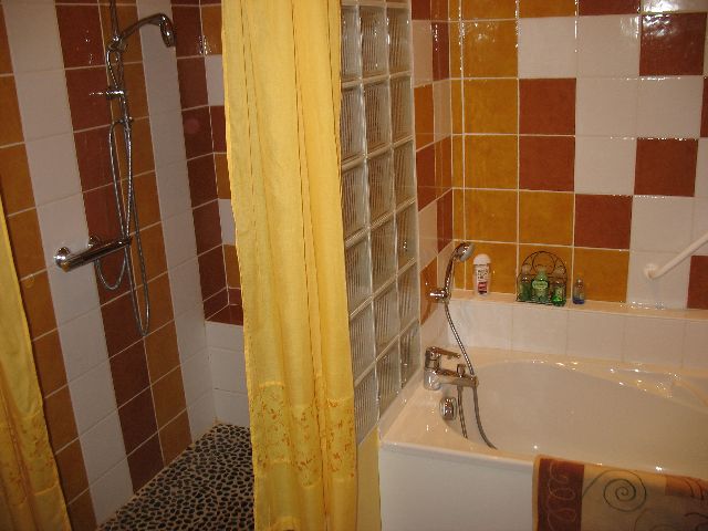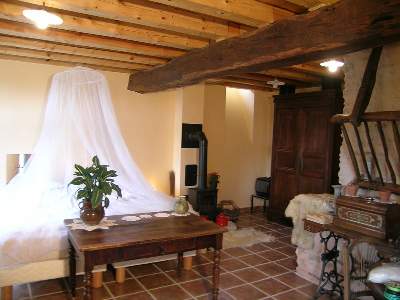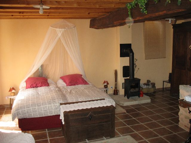 Cette chambre se trouve sur le rez de chaussé avec 2 lits de 90 par 200 cm, un lit bébé est disponible. La salle de bain est equipé d'une baignoire et une douche à galet. Petit feu à bois. Le tarif est 65 euros la nuit, petit dejeuner pour deux personnes compris.