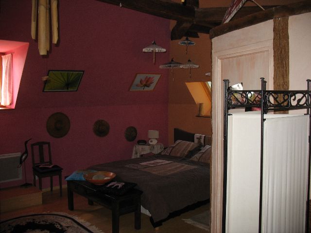 A l’étage se trouve la chambre Lotus avec un lit de 160 par 200 cm, douche, décoration "zen". Le tarif est 60 euros la nuit, petit dejeuner pour deux personnes compris.